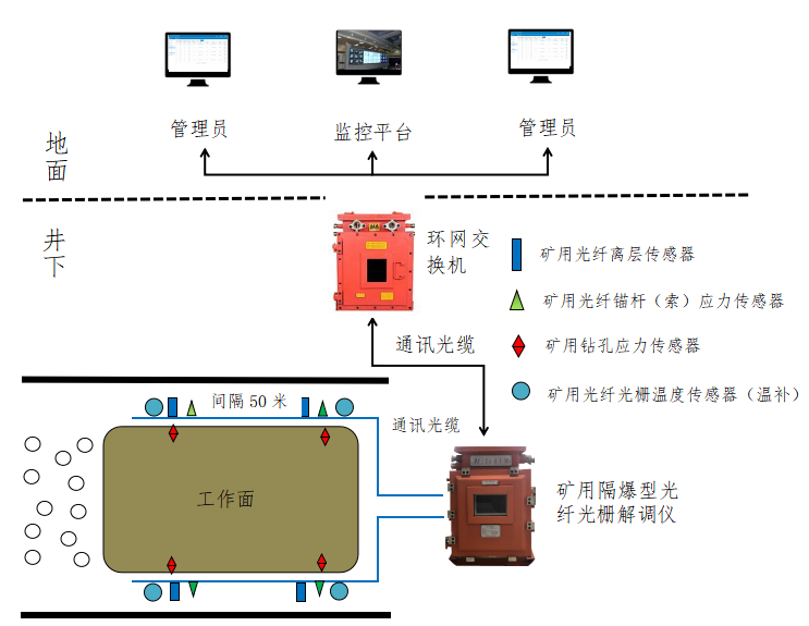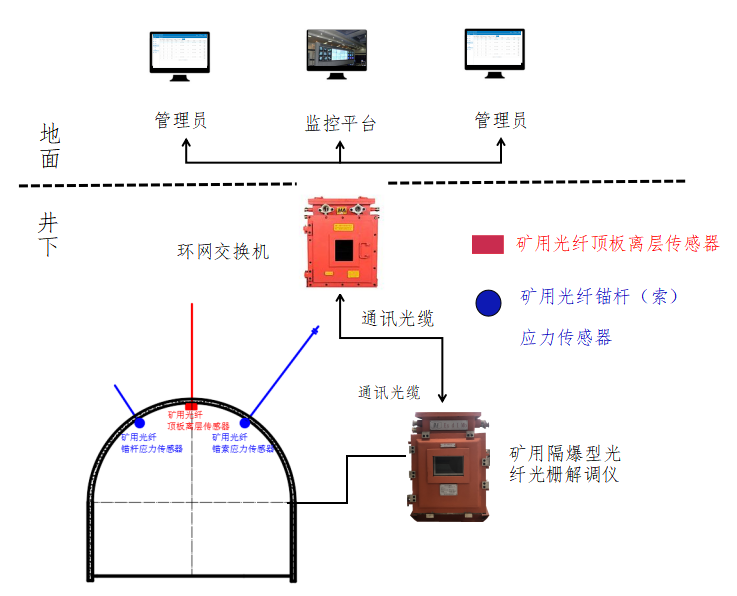 矿用光纤顶板应力动态监测系统实时监测煤矿巷道顶板、围岩的松动离层量、巷道锚杆(索)的锚护应力、煤体或岩体内部应力、支架受力等参数的安全监测。系统分为井上和井下两部分。