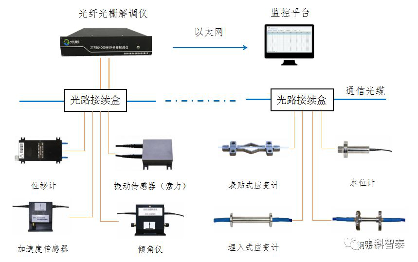 中科智泰桥梁结构健康安全监测系统采用光纤光栅类传感器,配合数据管理与处理系统,对桥梁跨梁的扰度、桥面的裂缝、应力应变、支座位移、关键桥墩的倾斜等参数进行实时自动监测,同时对桥梁所处的环境情况、桥面交通状况进行跟踪监测,并根据传感器数据和视讯观测及时发现桥梁运营中出现的问题,从而确保桥梁结构的运营安全。