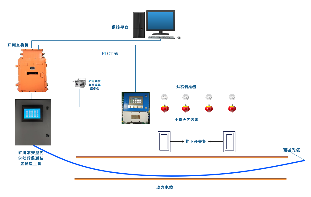 变电站综合监控预警系统主要由矿用本安型火灾参数监测装置测温主机/矿用隔爆型分布式光纤测温主机、隔爆兼本安型PLC控制箱、工控机、分布式光纤测温系统软件、烟雾传感器、超细干粉灭火装置、矿用本安型热成像摄像仪、感温光缆等组成。